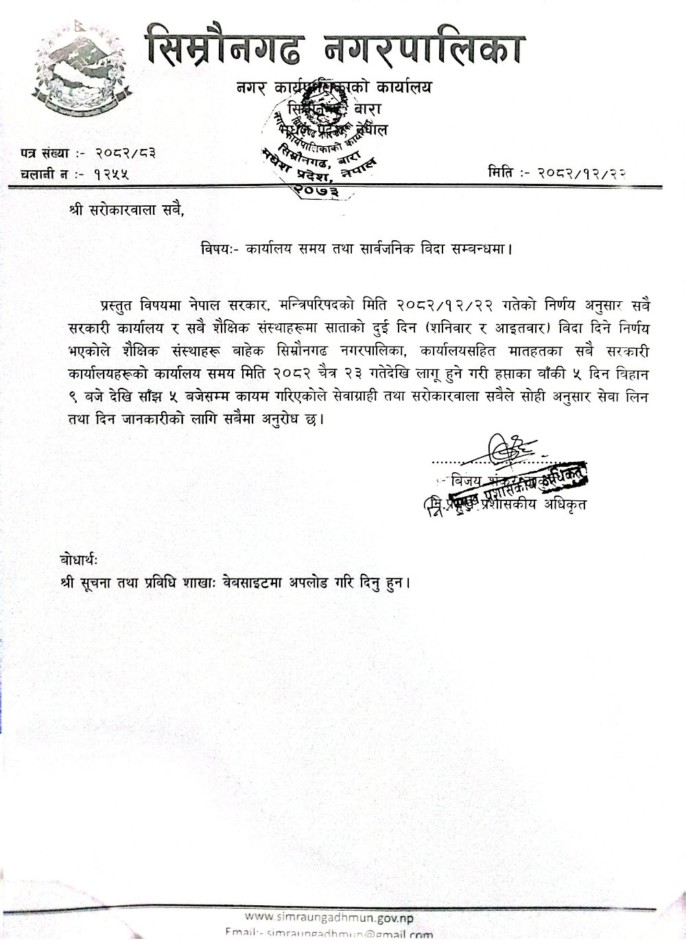 कार्यालय समय तथा सार्वजनिक बिदा सम्बन्धमा ।