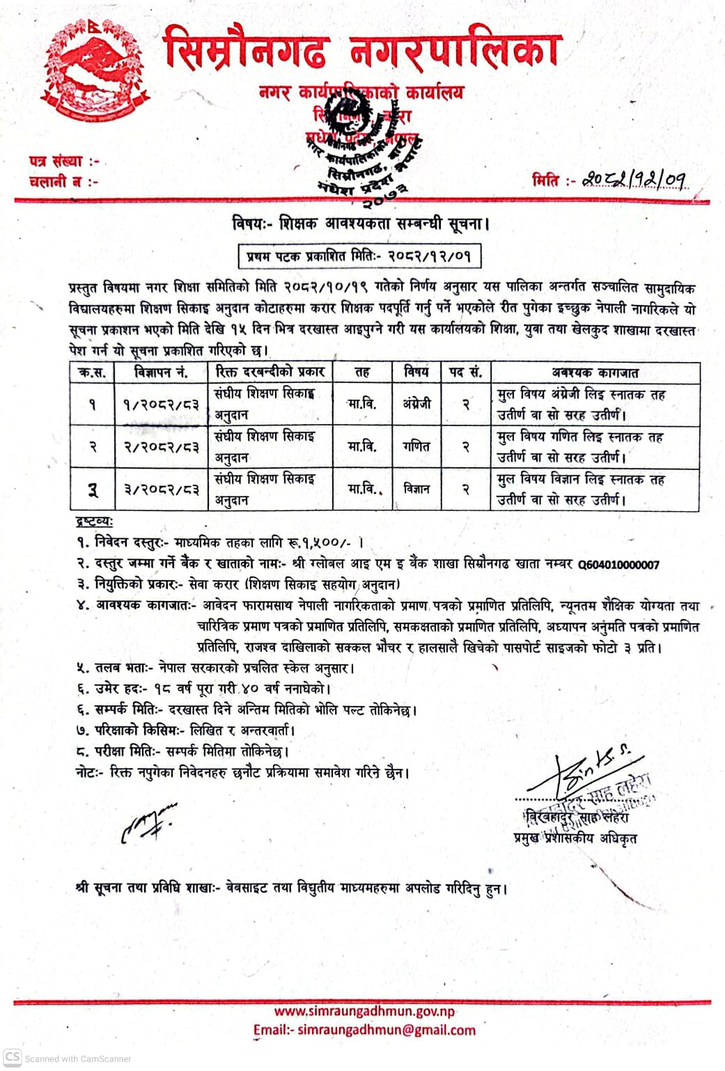 सेवा करारमा शिक्षक पदपु्र्तीको लागि सुचना अब्हान