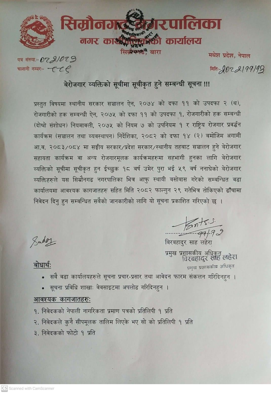 बेरोजगार ब्यक्तिको सूचिमा सूचिकृत हुने सम्बन्धी सूचना ।